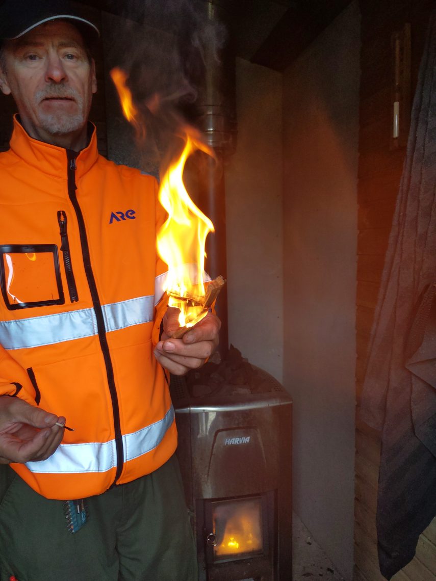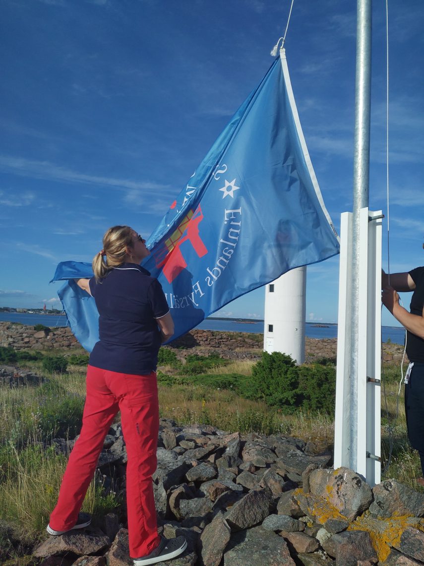 Siirryimme pikkuhiljaa lipun nostoon. Vili sai ensikertalaisena laittaa lipun salkoon. Matti lähti saunan lämmitykseen ja me muut rupesimme suunnittelemaan illan ruokaa. Miehet hoitivat grillaus puolen ja naiset valmistivat salaatin ja lisukkeet. Saumatonta yhteistyötä!