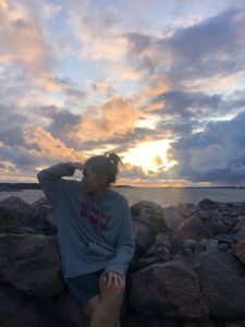 Kaksikon lähdettyä venelaiturista jatkoimme päivän askareita. Tiskasimme auringonpaisteessa ja pidimme purkukeskustelun juuri tapahtuneesta. Tulimme siihen lopputulokseen, että tästä on hyvä jatkaa etiäppäin ja kartuttaa lisää kokemusta. Tiskit selätettyämme lämmitimme lounaaksi ensimmäisen päivän lasagnea ja söimme ulkona. Lounaan jälkeen vietimme hyvän tovin kierrellen saarta ja hypellen auringon lämmittämillä kallioilla. Ihmettelimme Gustun ohittavaa valtavaa rahtialusta ja sen synnyttämien aaltojen iskeytymistä rantakiviin. Saarikierros sai dramaattisen lopun kun törmäsimme äkkiarvaamatta sihisevään rantakäärmeeseen – SOS! Pinkaisimme eri suuntiin ja tapasimme toisimme vasta talon kuistilla kauhusta kankeina. Sydän tykytti vielä hyvän tovin tapahtuneen jälkeen…