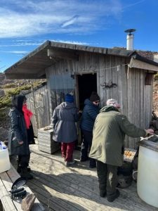 Ilokseni pääsin ensiksi oman ryhmäni kanssa saunaa lämmittämään. Vesijaottelu suolaiseen- ja makeaan veteen on tärkeää, sillä kiukaallehan ei voi heittää kuin makeaa vettä tai taivaalta saaviin satanutta, mistä se sitten johdetaan letkua pitkin alas saunalla olevaan toiseen saaviin. Saimme nauttia mahtavista löylyistä vähän myöhemmin ja muutama rohkea uskaltautui jopa kastautumaan mereen.