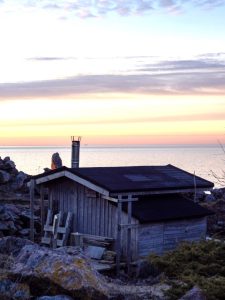 Sunnuntai aamuna pääsimme ihastelemaan auringonnousua heti kuuden jälkeen. Maistuvan aamupalan jälkeen siivosimme omat jälkemme viikonlopun jäljiltä. Yhdessä valmistetun lounaan jälkeen oli aika laskea Majakkaseuran lippu alas. Veneen odottelu sujui leppoisasti laiturilla auringosta nauttien ja Gustun tarinoita kuunelleen. On se jännä miten nopeasti 11 toisilleen vierasta ihmistä hioutuu yhdeksi toimivaksi ryhmäksi.