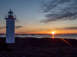 Lauantai-illallisen jälkeen pääsimme ihailemaan auringonlaskua ja odotimme majakan valon syttymistä. Gustavsvärnin majakka on ns. sektoriloisto. Mereltä katsottuna valkoisen sektorin vasemmalla puolella on punainen ja oikealla puolella vihreä valosektori. Yöpuulle levittäydyttiin pitkin Sumusireeninhoitajan taloa. Jokaiselle löytyi tyynypaikka ja uni tuli kaikille, enemmin tai myöhemmin.