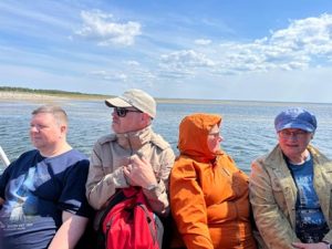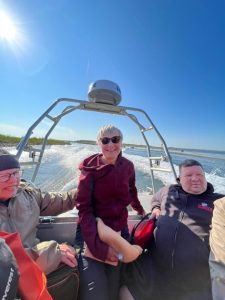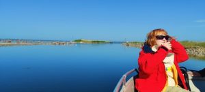 Vilsandissa meidät vastaanotti ihastuttava paikallinen opas Kadri, joka oli itse alun perin kotoisin saarelta ja pyöritti siellä pienimuotoista matkailutoimintaa aikuisten poikiensa kanssa. Kadri kertoi kansallispuiston luonnon säilyneen koskemattomana pitkälti sen vuoksi, että sen vesialueet ovat hyvin matalia, ja näin veneilijöiltä saavuttamattomissa. Siitä konkreettinen todiste oli venematkamme, joka kulki kapeissa tarkoin merkityissä väylissä, joissa veneen kyljet lähes viistivät sivuilla kohoavaa maata. Kadri kertoi, että joskus ihmiset saattavat jopa kävellä ja kahlata matalikkoa pitkin saareen, kun merivesi on loppukesällä tarpeeksi lämmennyt. Rohkeita kävelijöitä eivät haittaa edes upottavat mutaosuudet tai vastaan luikertava käärmeet! Tuulen voimakkuus ja suunta vaikuttavat luonnollisesti siihen, milloin olosuhteet mahdollistavat kulun saareen kävellen. Itse en ihan ensimmäiseksi lähtisi sitä kokeilemaan!