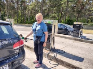 Outi tankkaamassa. Saarenmaalla autoilevan kannattaa huomioida, että bensa-asemat ovat harvassa