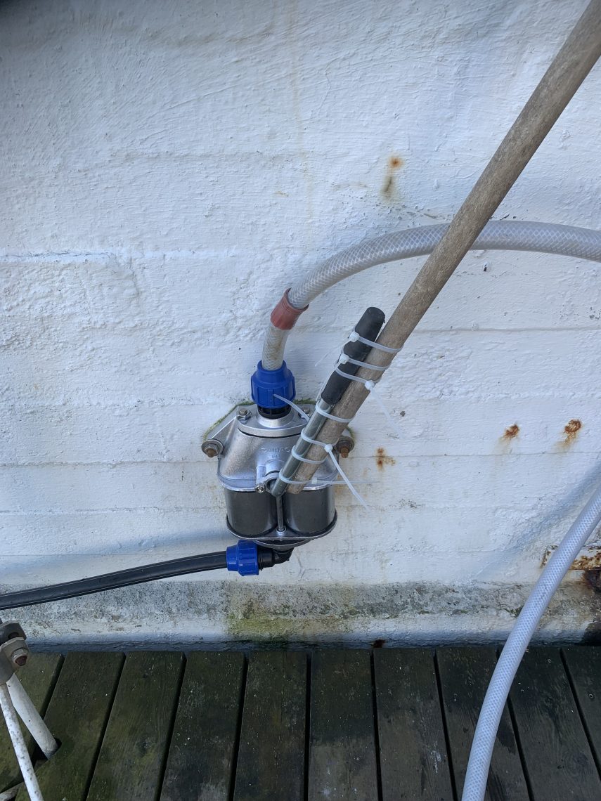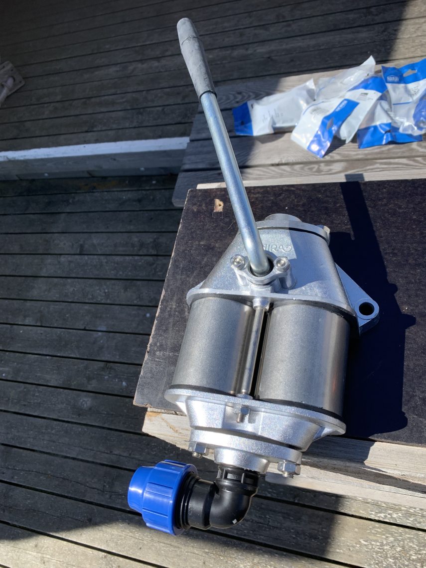 Kaiken tämän tohinan jälkeen todettiin, että ei ole kiva polvillaan vettä pumpata. Pikaratkaisuna löytyi hylätty harjanvarsi, joka puolitettiin ja kiinnitettiin aika monella nippusiteellä väliaikaisesti, kunnes löytyyn parempi ratkaisu. Kauniskaan se ei ole!