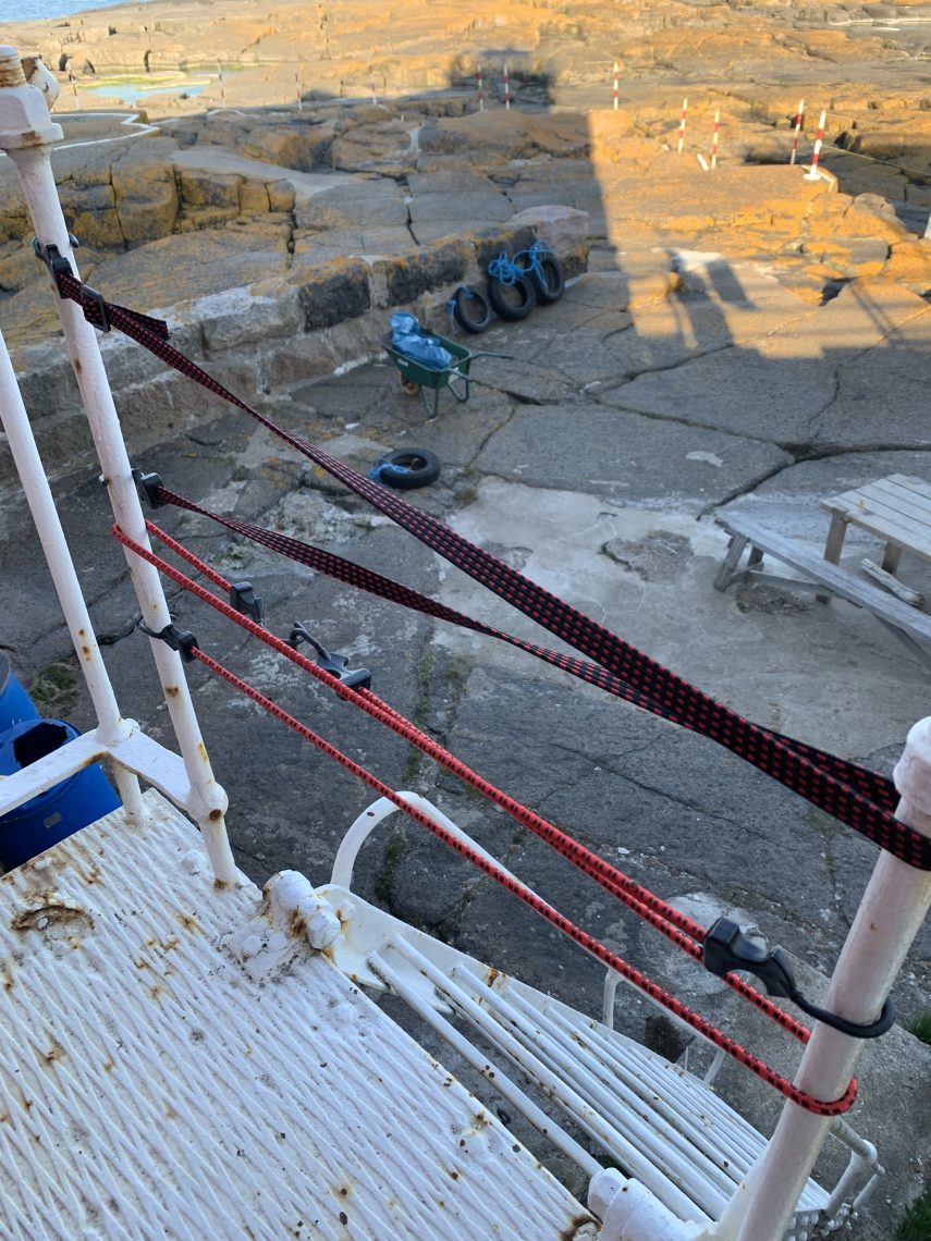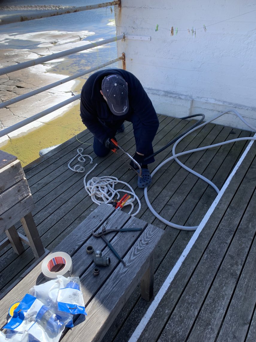Seuraavaksi vaihdettiin kulmapala, ja kun vanha liitos piti irrottaa niin letku tiputettiin hallitusti alas, jotta sekin voitiin työstää. Nostettiin takaisin liitoskorkeuteen narun avulla ja tämä vetonaru kiristettiin asennuksen ajaksi kaiteeseen kiinni, ja jotta tämä ei ole “toimii niin kauan kuin perävalot näkyy” -toimitus, niin jätettiin asennusnaru paikoilleen toviksi.