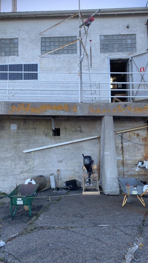 Siirsimme tavaramme pihaan ja valmistauduimme Taiston kanssa selvittämään sotkuun mennyttä kieppiä. Se oli nopeasti fixattu. Ensimmäisessä nostossa kuorman päälle alkoi tippumaan ruostepaloja, hetkinen mistä ne nyt tulivat? Kuorman pysäytys ja hallittu lasku takaisin kalliolle ja asiaa tutkimaan. Tämä meri-ilmasto on tehnyt vuosien varrella kataluuksiaan eli vaakapuomin kiinnitys on ruostunut puhki. KÄYTTÖKIELTO, voimassa heti, ja siihen asti kunnes uusi on saatu asennettua! Tuli kaikkia tavaroita ylös kantaessa mieleen sanonta: se mikä ei tapa niin se vahvistaa. Nyt sanonnassa on järkeä, tavaroiden kantamisessa ylös kyllä hengästyy ja sehän tarkoittaa liikuntaa ja kunnon kohotusta. Ainakin väliaikaista.