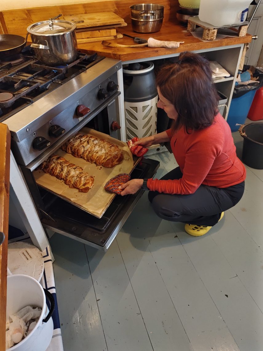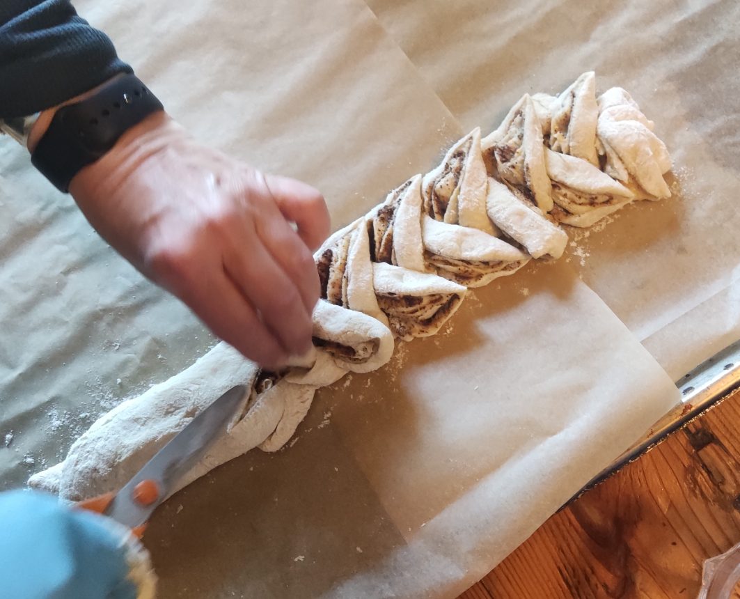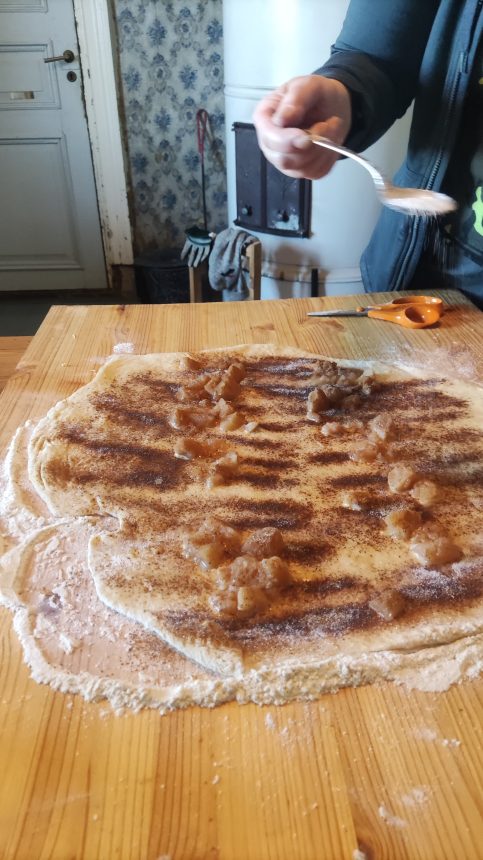 Leipastiin pullaa, Sari otti kuvat talteen, jotta osaa kotona tehdä samanlaisen pitkon. Täytteenä oli  kotoa tuotua omena-päärynä kompottia, joka oli tehty Ahvenanmaan tuotteista.