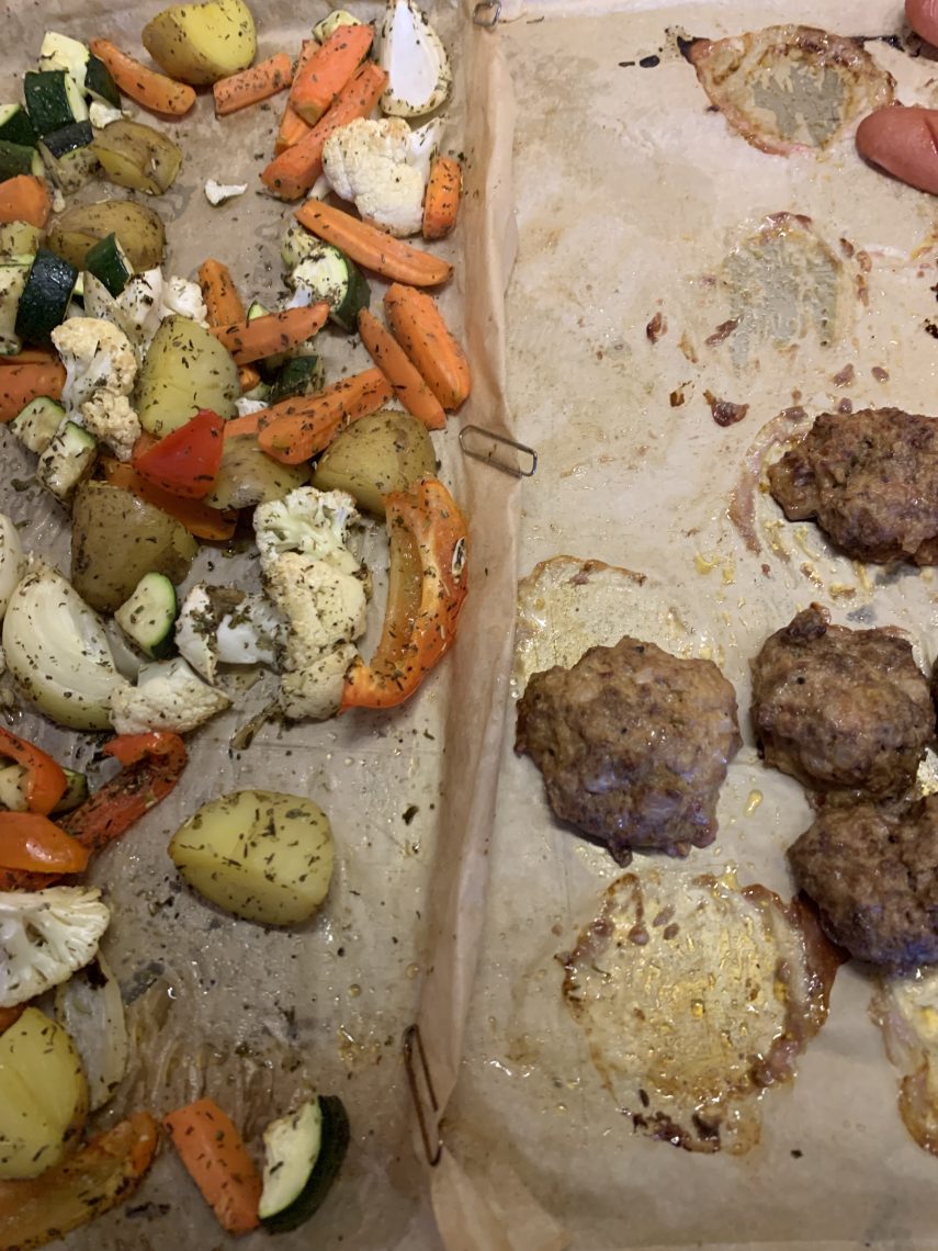 Päivälliseksi meillä oli ihan tavanomaista ruokaa, mutta Sarin patentti siihen, kuinka voi samalla pellillä kypsentää kahta erilaista ruokaa on kertomisen arvoinen. Toiseen annokseen kuului laittaa ruokaöljyä, jota ei haluttu valuvan lihapullapuolelle. Klemmarit olivat ratkaisu!