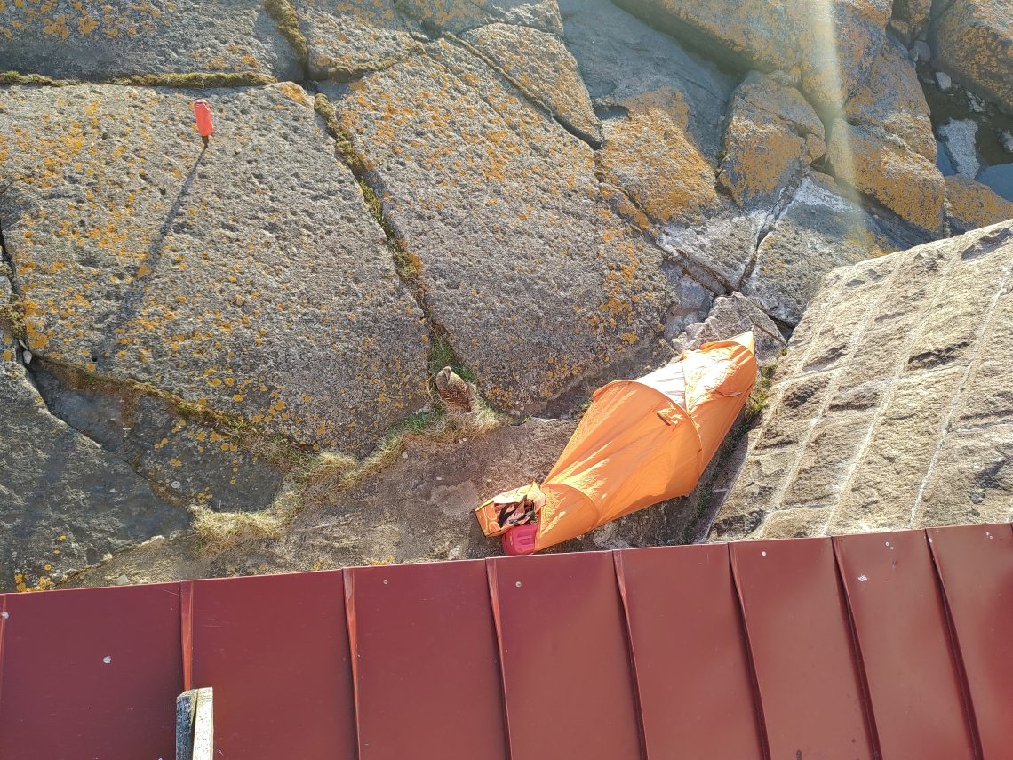 Sari on tuonut mukanaan teltan ja makuualustan jne. Teltan pystytys majakan länsipuolelle majakan ja venevajan kulmaan.