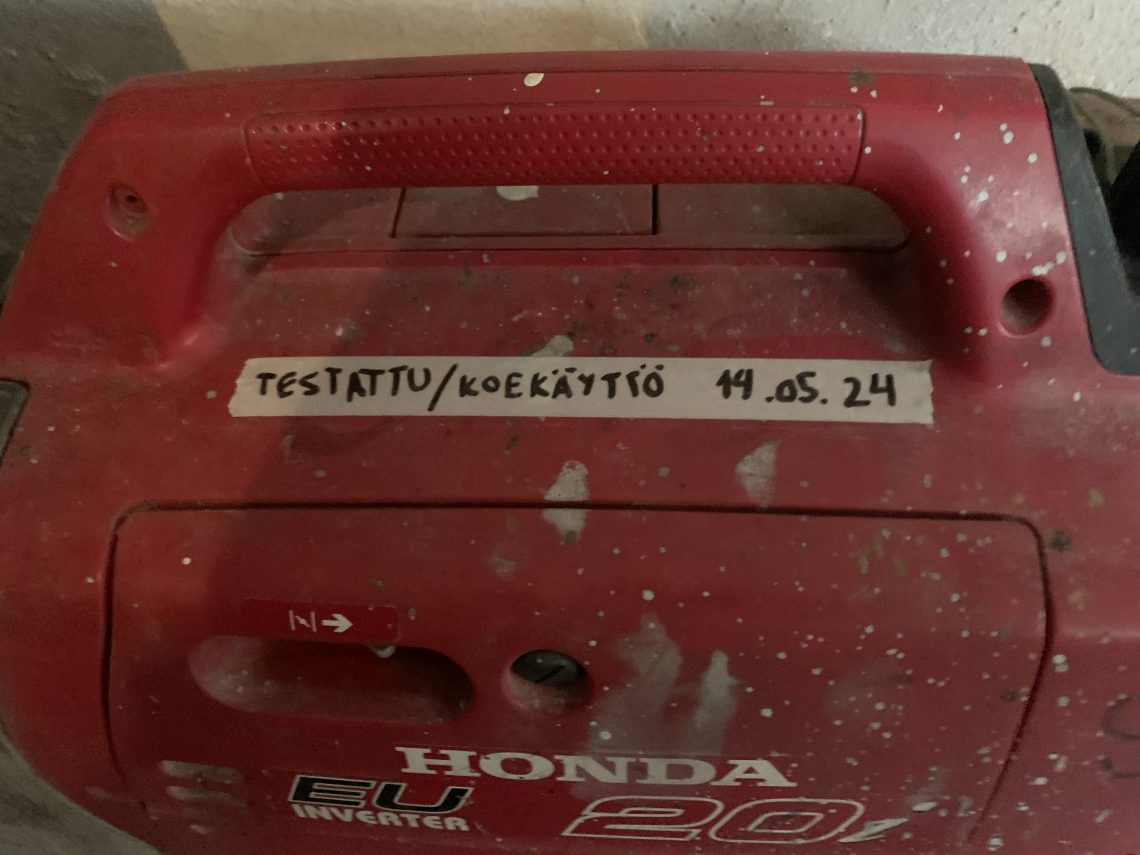 No siirrytään oikeisiin töihin. Tuli testauspyyntö, ensin ei muka löydetty Hondaa testaukseen (agregaatti), kun taitaa nakki napsahtaa! Hondan matka taitaa jatkua Strömmingsbådaniin. Kukahan sen kantaa alas, kun ei ole vinssiä? Raahattiin kone ulkoilmaan ja sitten Aleksei tutustui ohjekirjaan ja kohta kuului gongilta sellainen ääni, että laitteessa ei ole mitään vikaa. Aleksei vaihtoi vielä koneen päälle uuden lapun testauspäivästä.