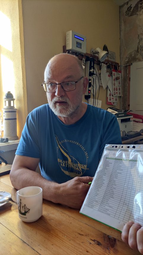Taisto on tehnyt merkinnät listaan, jossa mustalla täpällä on merkitty lajit, joita ei Märketillä voi tavata, kuva Sari N.