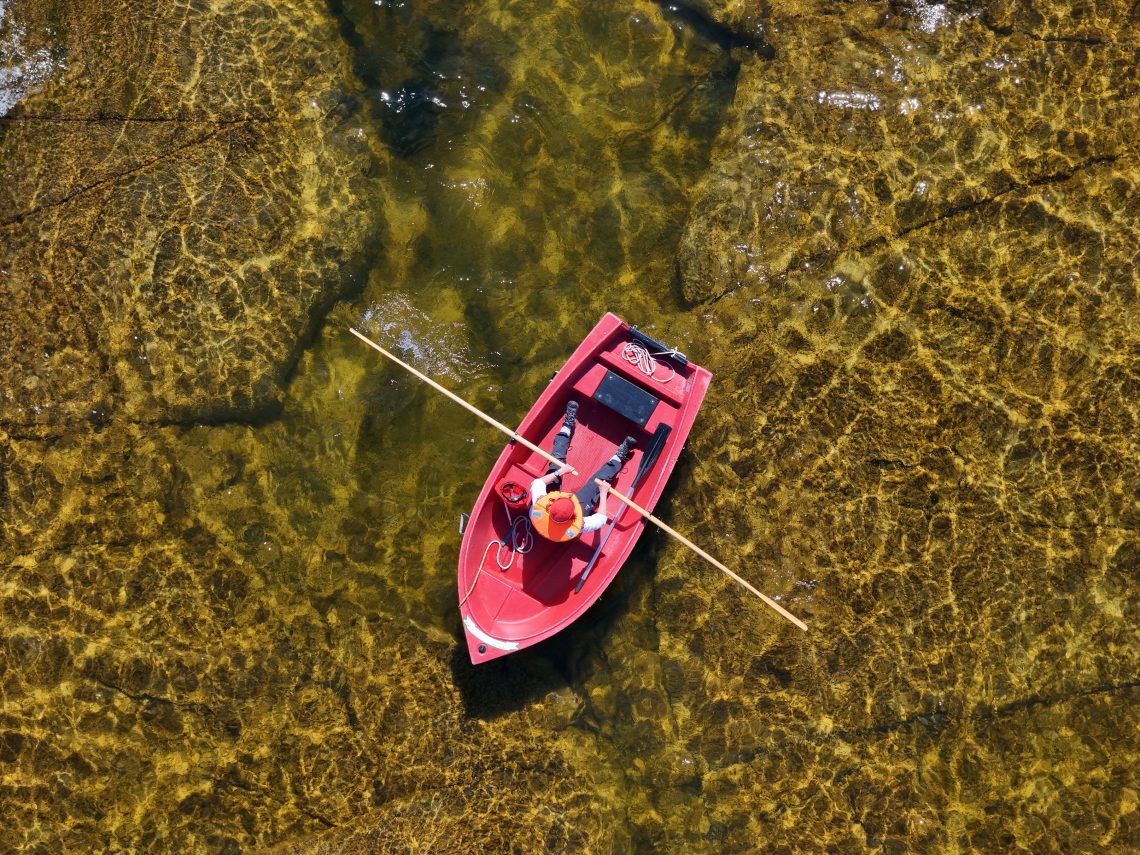 Sari halusi testata vadelmaveneen! Hankaimet ovat veneen keskilaatikossa ja airot valkoiseen veneeseen kiinnitettynä.