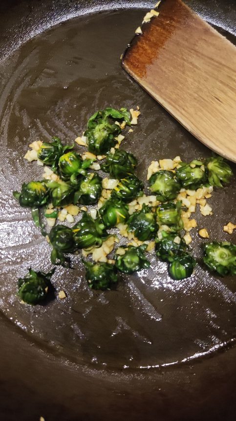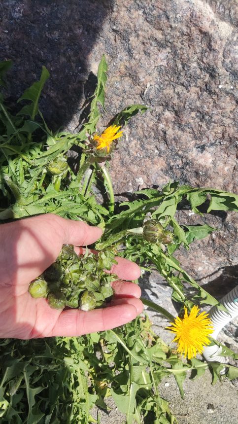 Sari piti villiyrttikurssin, mutta todella lyhyellä oppimäärällä. Otetaan puhalluskukkien nuput (siis voikukkia) ja tehdään niille pari taikatemppua pannulla (ainakin paistettiin valkosipulissa) ja avot oli hyvää. Kuvat Sari N.