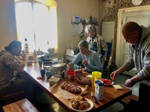 Today, we started the day with a coffee and a fresh cinamon brioche still hot from the oven, before to say goodbye to Paula and Ilkka, and be joined by Jonna, Sammy and the radio amateur team. To take part of the life here, making the dishes, sharing a meal, talking… for a moment we have the feeling of being part of a place. And for us living on the move, this is precious.
