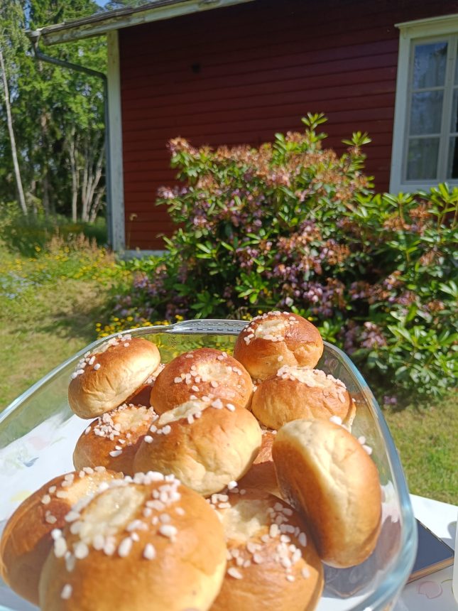 Saimme hieman jatkettua nurmikon trimmaamista, mutta trimmerit ovat temppuilleet meille aika tavalla. Perinteinen harava on onneksi helppokäyttöinen, ja olemmekin haravoineet monta kottikärrylistä heinää. Lisäksi Kaisa on leiponut pullaa sekä myytäväksi että meidän iloksi. Kaisa on muutoinkin vastannut suureksi osaksi ruuanlaitosta ja leipomuksista.