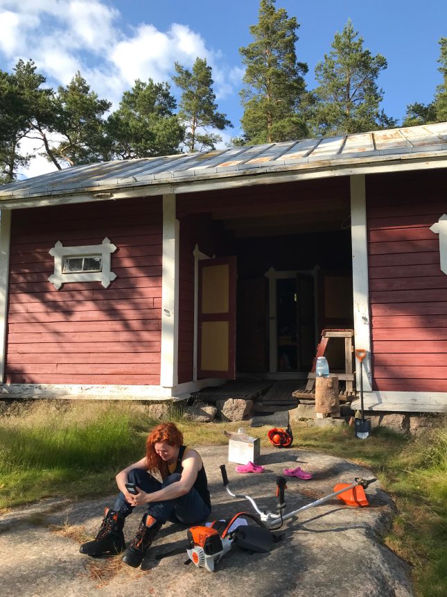 Keskiviikkona Yttergrundilta lähti Tommi, ja tilalle Harry toi veneellään Kaisan, Ainon sekä ensikertaa talkoilemaan tulleen Mariannan (me muut olimme viime vuonna ensimmäistä kertaa). Näytimme Mariannalle saarta ja tutustuimme mm. kaupan toimintaan. Nautiskelimme kesästä silokallioilla, söimme hyvin ja saunoimme pehmeissä löylyissä.