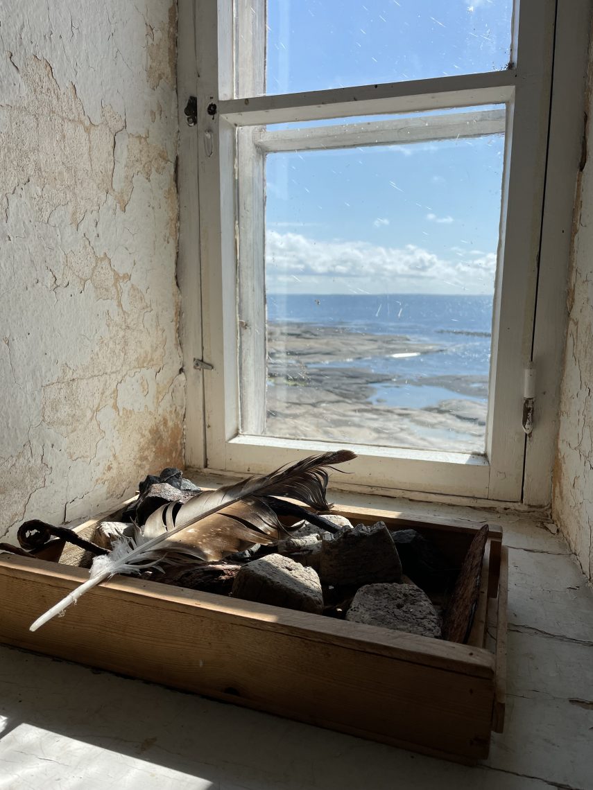 Kirsi ja Minna ovat ihastuneet makasiinin päätyyn, jonka portailla jompi kumpi usein istuu. Kirsillä on yleensä mukanaan kamera, Minnalla kudin. Majakan portailta voi seurata, kuinka haahkanpoikanen harjoittelee sukeltamista, tiirat paimentavat poikasiaan ja sirrit kipittävät etsimässä ruokaa.