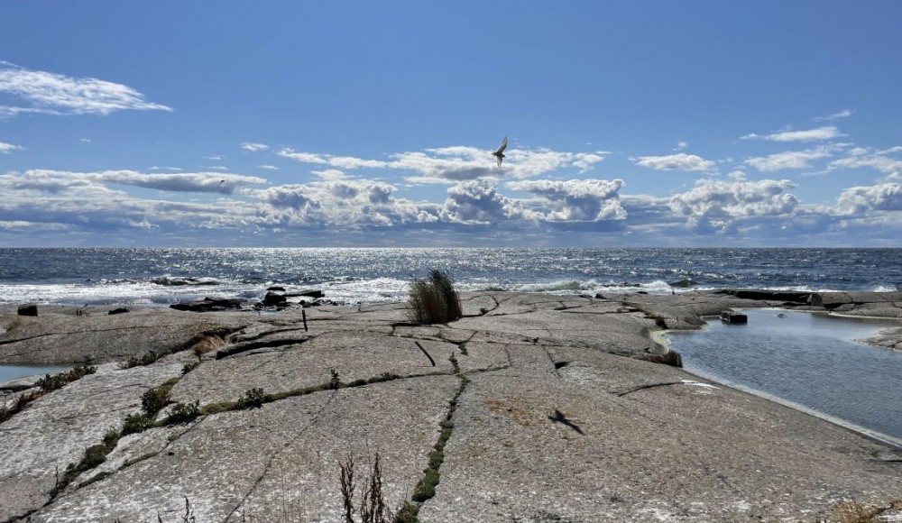 Eivät lentäneet, sillä Bengt toi meidät rauhallisesti ja vakaasti läpi tyrskivien aaltojen aurinkoiselle Märketille ja ehtipä hän näyttää meille valtavan suuren merikotkan pesänkin matkalla. Koska merenkäynti oli myös majakkasaaren ympärillä niin kova, nousimme maihin saaren itäpäädyn kallioilta. Edes poijuvaihto ja kumivene eivät tuulen takia olleet hyvä vaihtoehto. Itäpäätyyn rantautuminen on kuulemma Bengtin erikoisuus, ja kauniisti veneen keula rantakallion viereen solahtikin. Aallot eivät häirinneet tavaroiden lastausta lainkaan.