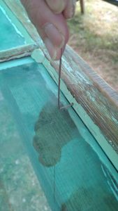 Marjo ja Tuija rapsuttivat vanhoja maaleja ja kittejä karmeista. Yhteisvoimin lasien irroituksessa yhteen (onneksi ei ollut vanhaa lasia) tuli särö. Pääsisimme siis harjoittelemaan lasin leikkuuta.