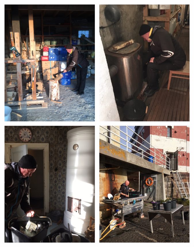 Sitten kaikille on jaettu omat vastuualueet. Mun tehtävä on päivittää blogia, Johanna on vuorovastaava, A-K ruokavastaava ja Esa jokapaikanhöylä. Mutta yhessä tehään kun tulee jotain tehtävää ja kaikki auttaa sapuskan kanssa ja ottaa omia lisätehtäviä. Mä otin pissavessojen siivoomisen kontolleni. Esa haluaa tiskata kaiken. Johanna on yhteyksissä maihin ja pitää huolen turvallisuudesta. A-K hoitaa ruuan lisäksi majakan lämmittämisen.
