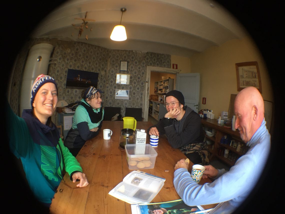 Lite info med enkla och kanske dåligt svenska 🙂 Så här vi är på fyret! Jag är Kaija from Tammerfors och jag är här på förstä gången. Johanna har varir här många gånger. A-K har just blevit en storföräldran till parsson russel terrier och Esa är här at diska varje dag. Vad gul!