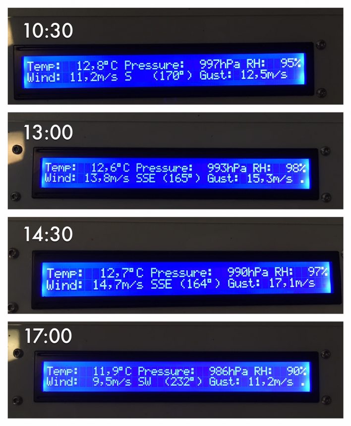 Meillä kävi tuulet yli 14ms ja se määritellään vasta kovaksi tuuleksi. Kävin ulkona 13ms tuulella ja aika pirun kovalt sekin tuntu, vaikka virallisesti se on vain navakkaa tuulta. Huomatkaa tsekata kuvasta myös ilmankosteus 98% parhaimmillaan!