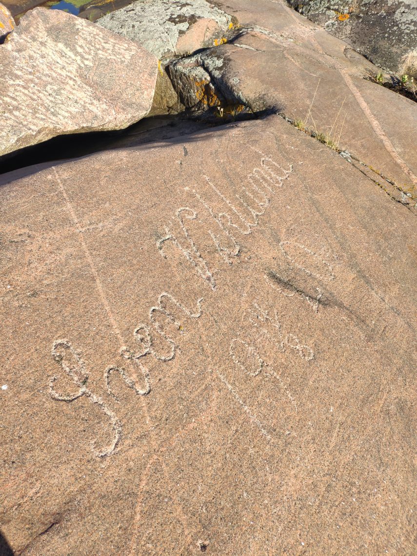 Kävimme kiertämässä saaren kalliot paikantaen purjelaivojen kiinnitysrenkaat. Niitä löytyi neljä. Tosin yhdestä puuttui rengas. Samalla löysimme tagien esi-isän-> Majakanvartijaperheen poika Sven oli jättänyt jälkensä historiaan.