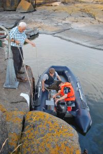 Ennen arvioitua saapumisaikaa kiikaroimme, näkyisikö purjevenettä horisontissa, mutta purjevenettä ei millään näkynyt. Nuoret sattumalta kiipesivät majakkatorniin katselemaan maisemia, ja huomasivat, että purjevenehän on jo aivan luodon vieressä. Portaita alas juosten, köhköh siis nopeasti kävellen, riensimme lähes koko talkooporukka auttamaan venettä rantautumisessa.