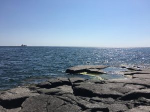 Aamu alkoi jälleen aurinkoisena ja vähätuulisena. Aamupalan ja aamun radioyhteyksien jälkeen me nuoret lähdimme kumiveneellä läheiselle Märketshällanin luodolle, josta rantautumisen jälkeen avautui upeat näkymät Märketille (alla oleva kuva), ja muualle avomerelle. Luodon viereisillä vesillä oli myös useita hylkeitä polskuttelemassa. Samalla nuoret harjoittelivat kumiveneen nostamista ja veneilysolmujen tekemistä.