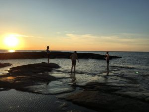Päivän päätteeksi nuoriso haastaa rantakivetyksen aallot.
